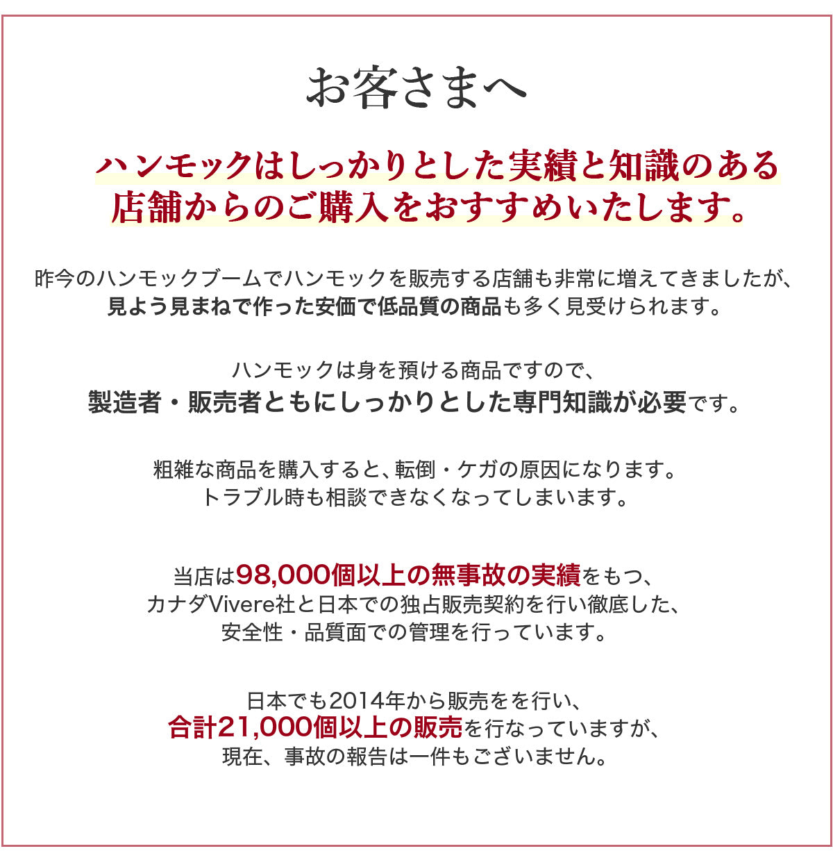 Vivere(ビブレ)ハンモックは日本販売開始から9年。日本全国の施設から導入、リピート購入を頂いております。