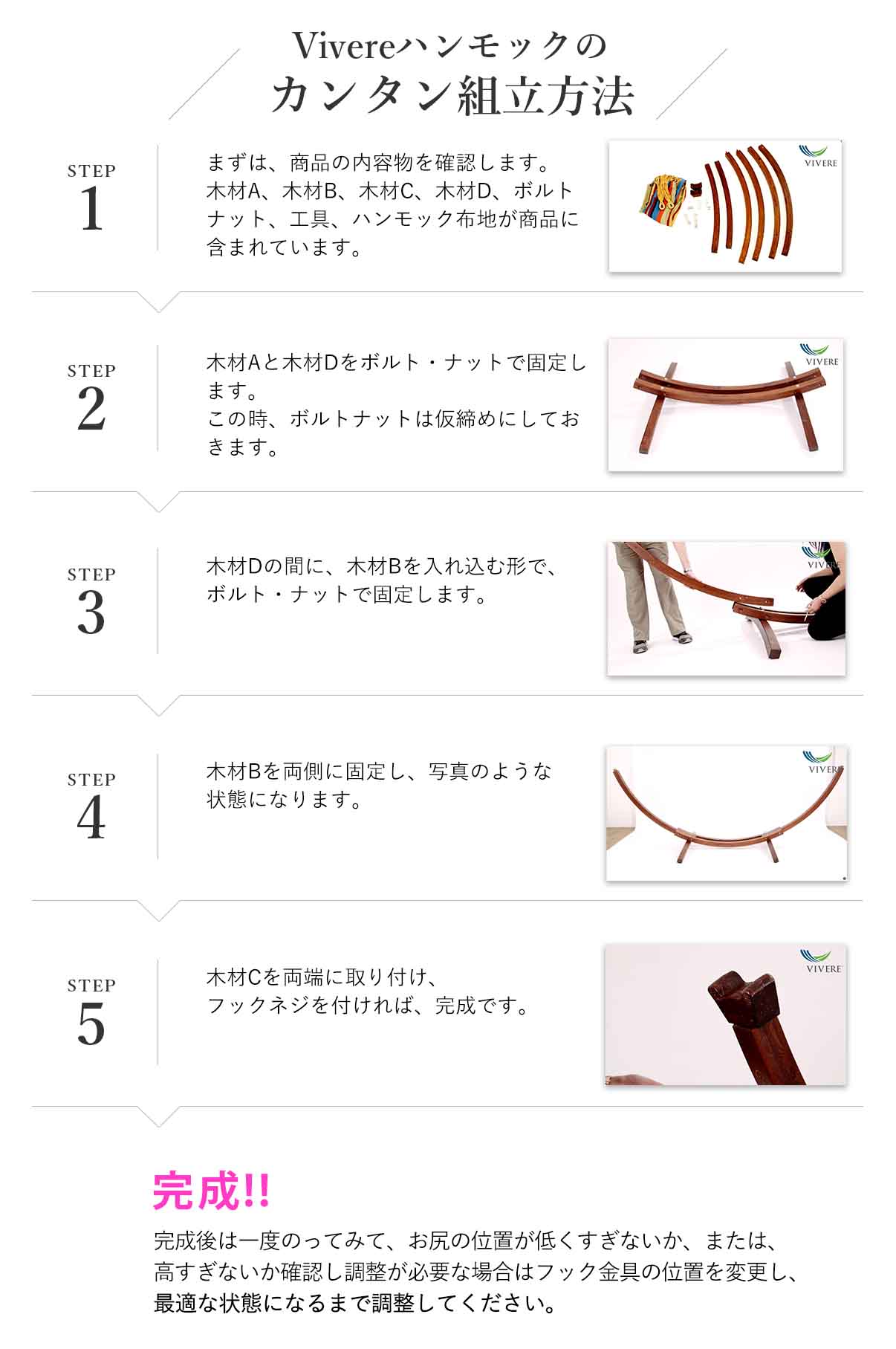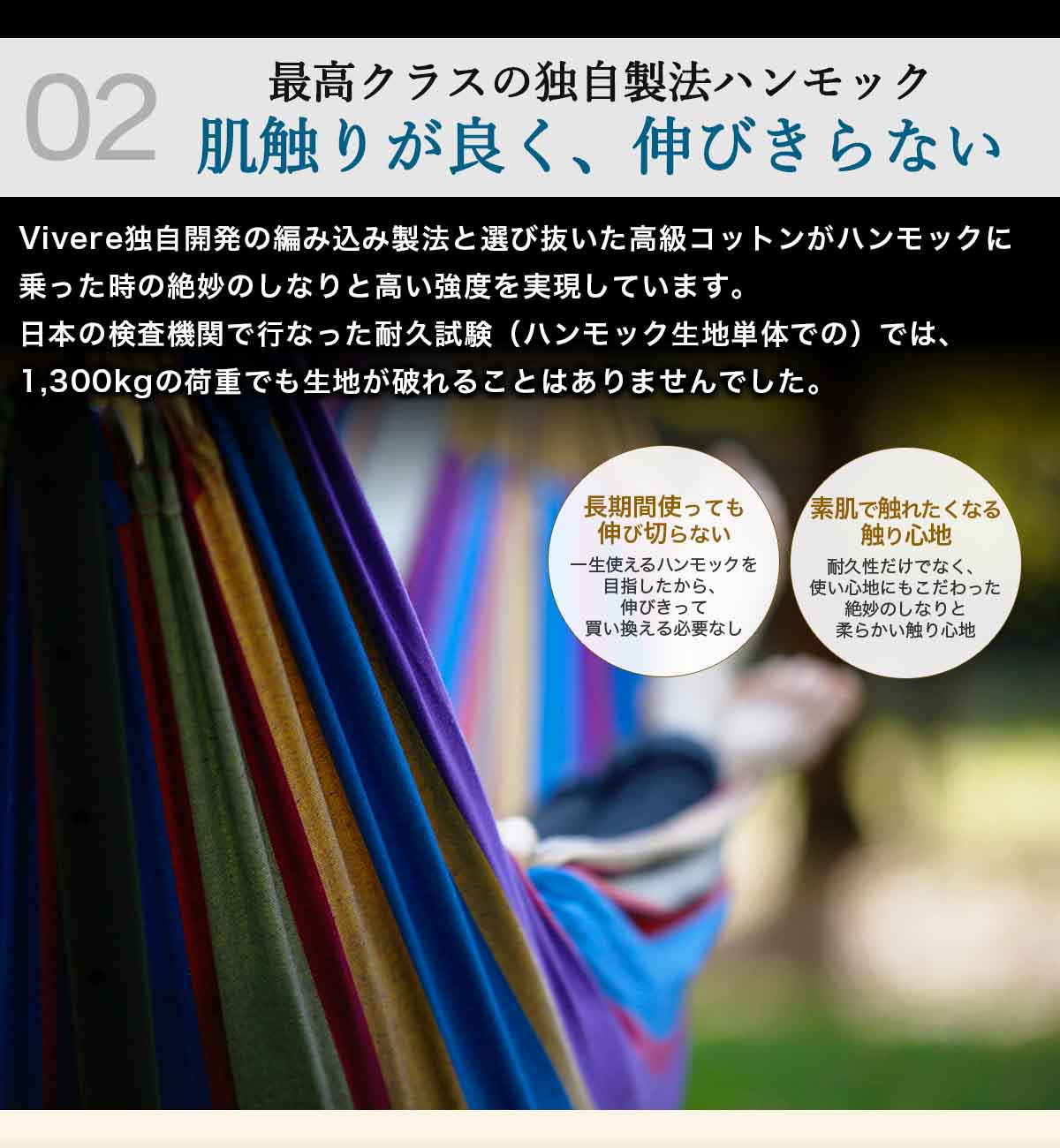 そこで、Vivere(ビブレ)ハンモックは、ハンモックの安定感、使用中の安全性はもちろん、人間工学的にハンモックをデザインし、使用者の使い心地を最優先して、開発を行ってきました。Vivere(ビブレ)では20年以上に渡り、試作、品質改善に取り組み続けています。